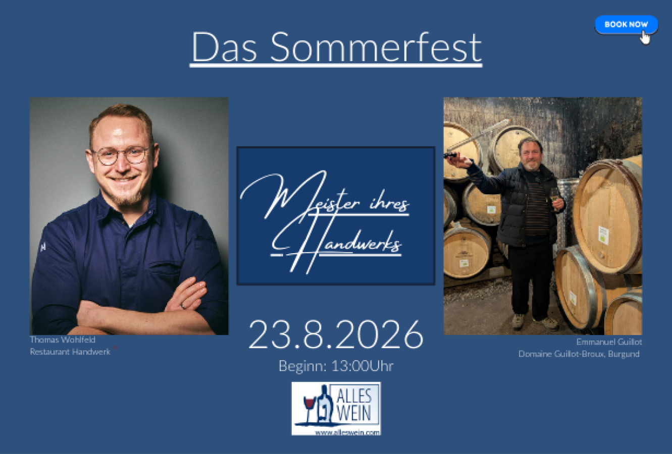 Die Domaine Guillot-Broux zählt zu den Pionieren des biologischen Weinbaus im Burgund. Ihre Weine sind auf den Karten vieler renommierter Restaurants weltweit vertreten und begleiten an diesem Nachmittag ein fulminantes, klassisches Burgunder Menü aus der Feder von Sternekoch Thomas Wohlfeld und seinem Team vom Restaurant Handwerk.